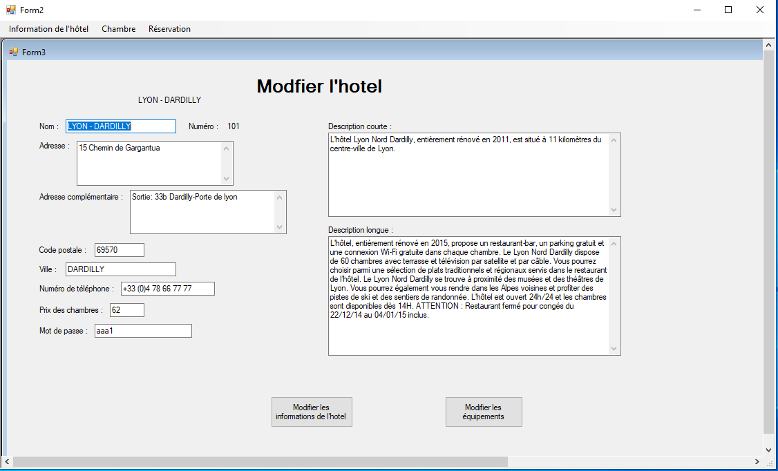 Fonctionnalité n°2 - Modification des informations de l’hôtel : nom, adresse, tel, description, prix, mot de passe, et équipements de l’hôtel.